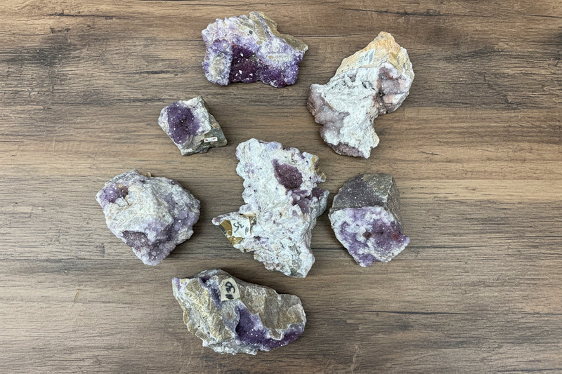 This appealing collection features 7 chunky Thunder Bay amethyst specimens showcasing a beautiful range of purple color tones and striking hematite inclusions. Sourced directly from our family mine, these substantial pieces offer collectors excellent variety and value, with each specimen displaying its own natural character and geological interest.