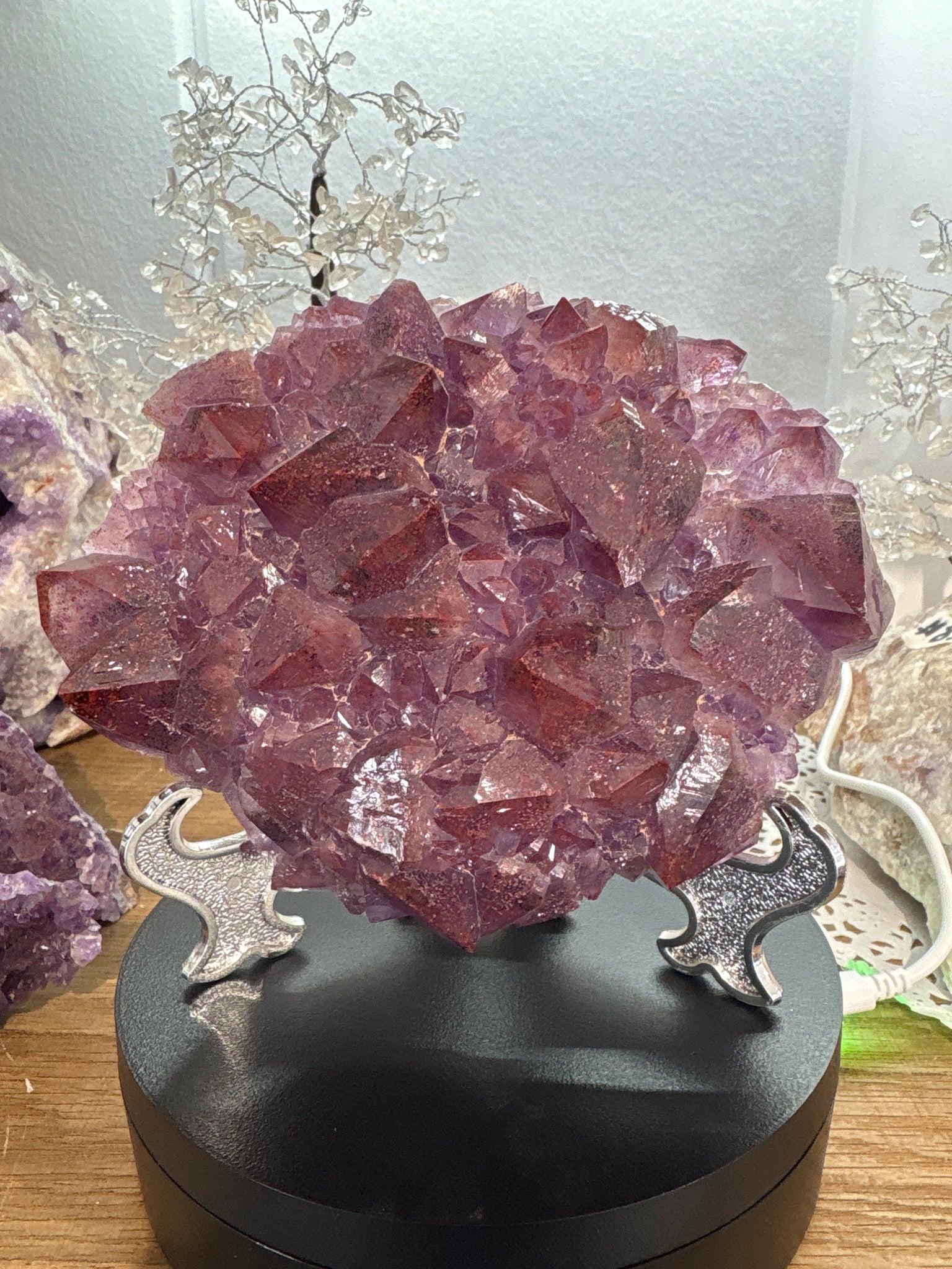 - Features: Natural hematite inclusions, multiple crystal points, beautiful cluster formation, rich purple coloration