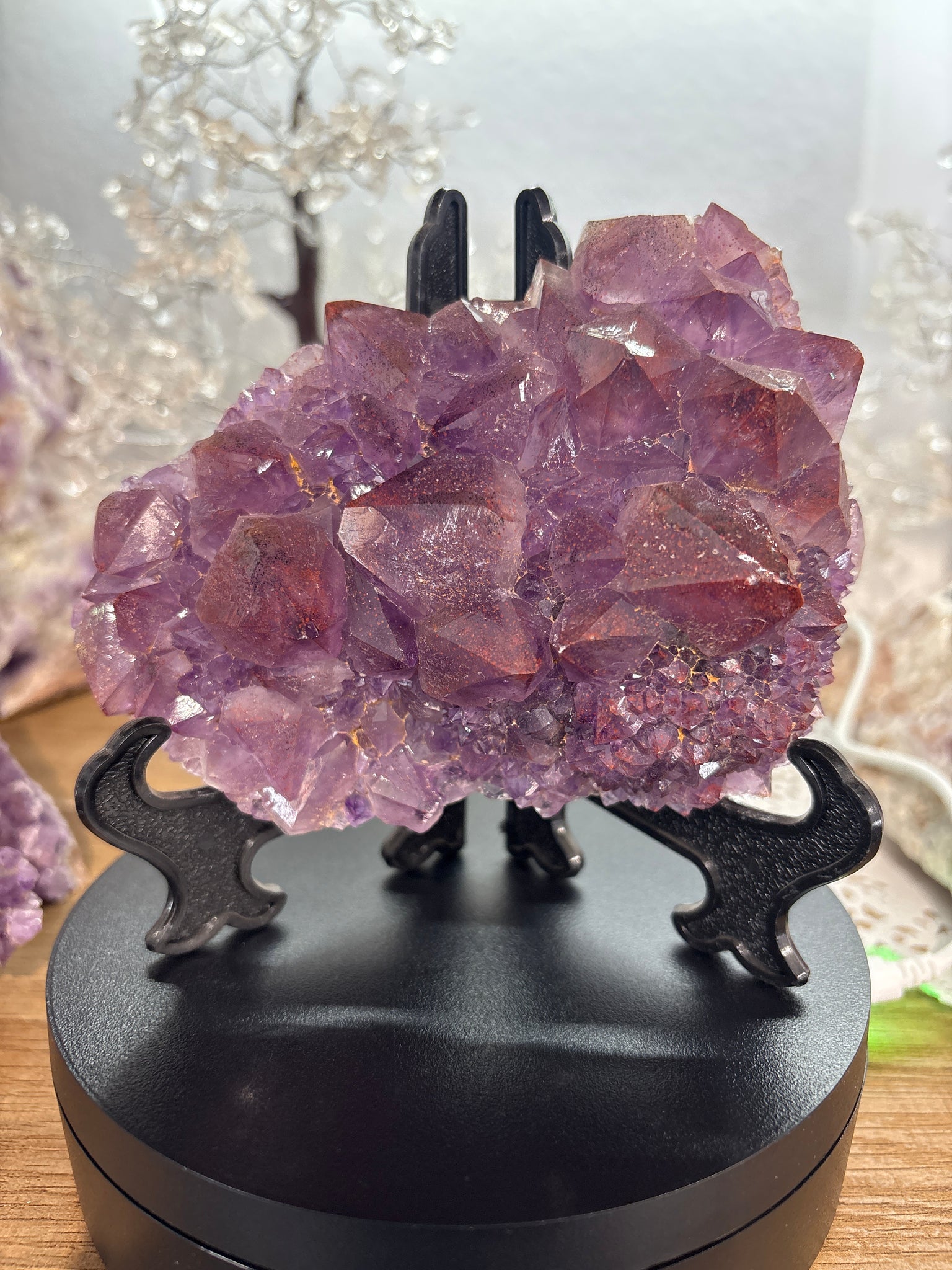 Experience the extraordinary beauty of this premium Thunder Bay amethyst specimen, showcasing remarkable hematite inclusions and fascinating crystal size variations throughout. This elongated piece displays exceptional structural diversity, with varying crystal formations that create visual interest from every angle.