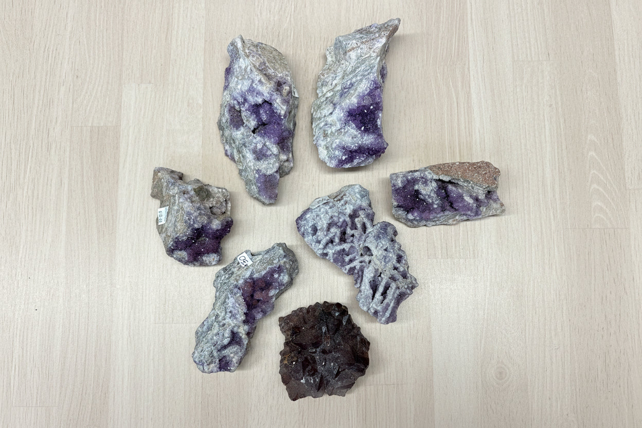This exceptional collection features 7 chunky Thunder Bay amethyst specimens showcasing unique natural formations, stunning crystal arrangements, and striking hematite inclusions. Sourced directly from our family mine, these distinctive pieces offer collectors remarkable variety and geological interest, with each specimen displaying its own natural character and beauty.