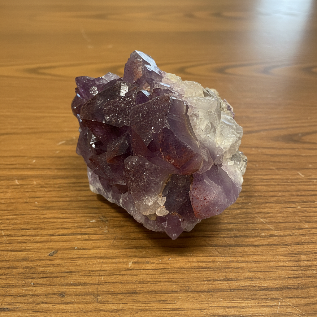- Features: purple amethyst crystals, hematite crystal inclusions, small crystal pockets on reverse, natural barite formations
