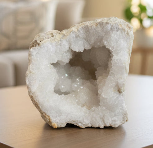 Discover the mesmerizing beauty of this authentic Moroccan geode, a stunning natural crystal specimen that showcases millions of years of geological artistry. This premium piece features sparkling crystal-lined cavities with unique mineral formations that captivate collectors and enthusiasts alike.