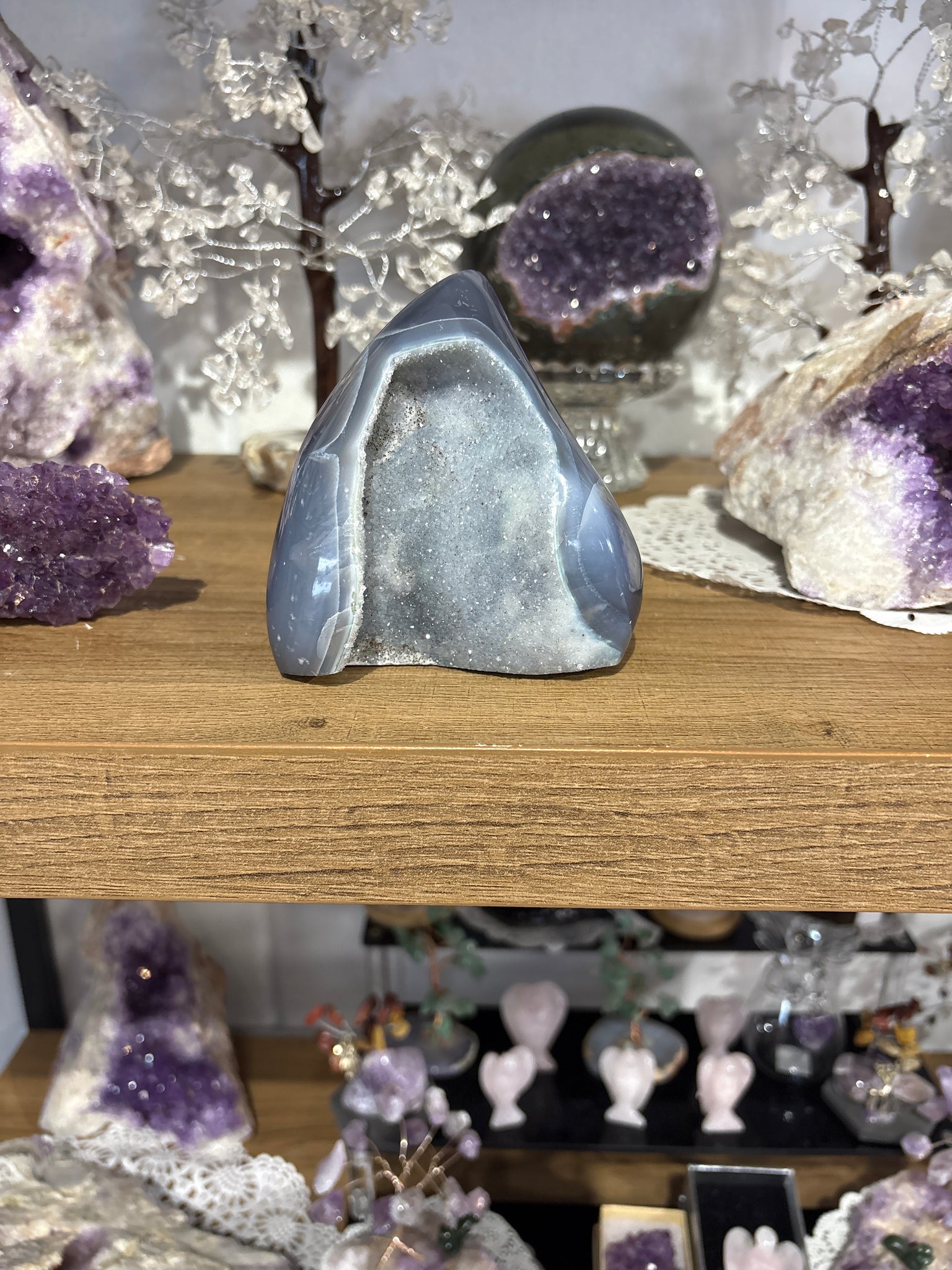 Experience the mesmerizing beauty of this hand-polished Brazilian agate flame, showcasing nature's artistry through stunning crystal druzy formations and intricate natural banding. This premium specimen combines the grounding energy of agate with the dynamic flame shape, revealing layers of geological history and sparkling crystal pockets that catch the light from every angle.