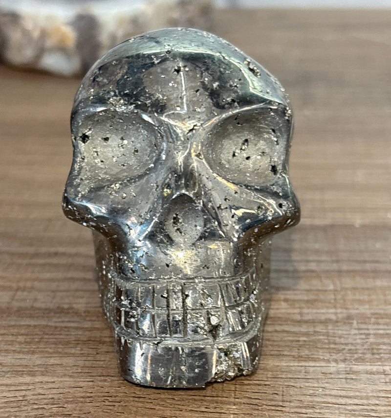 - Features: Brilliant golden metallic luster, natural cubic crystal inclusions, detailed skull carving with anatomical features, substantial weight and presence