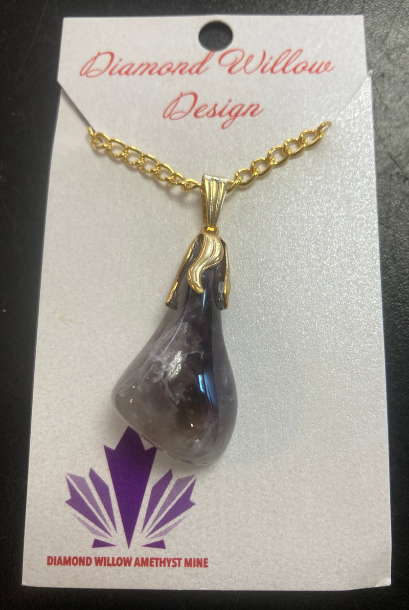 This elegant Amethyst necklace displays a stunning Diamond willow amethyst pendant, expertly crafted for a unique and luxurious touch. The beautiful gemstone is believed to promote inner strength and spiritual growth, making it the perfect addition to any jewelry collection. Elevate your style and energy with this exquisite piece.