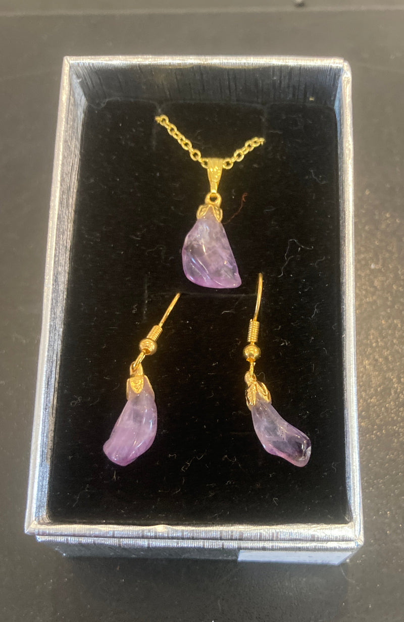 This locally crafted necklace and earring set is made with Diamond Willow Amethyst, known for its stunning color and healing properties. The perfect addition to any outfit, this set makes a powerful statement and promotes balance and harmony in the mind and body.