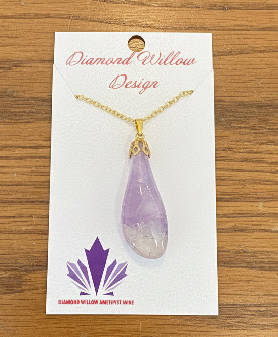 This stunning Amethyst pendant necklace is crafted with tumbled, hand-dug Thunder Bay Amethyst from Diamond Willow Amethyst Mine. Exuding natural beauty and elegance, this necklace is perfect for any occasion. Experience the power of amethyst and add a touch of sparkle to any outfit.