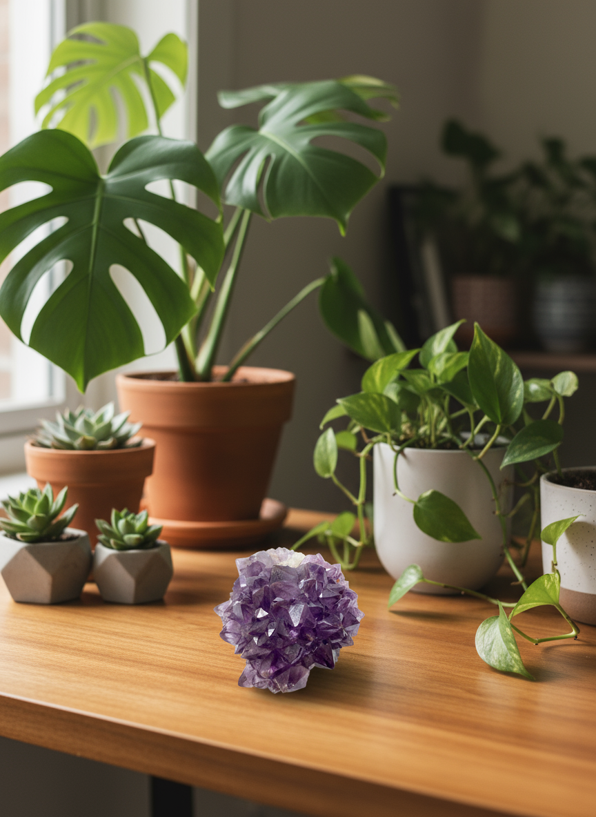 Enhance your space with our Purple Amethyst Cluster. This natural Canadian amethyst is handpicked from Diamond Willow, a family-owned and sustainable source. Enjoy its soothing and calming properties, with its beautiful purple color adding a touch of elegance to any room.